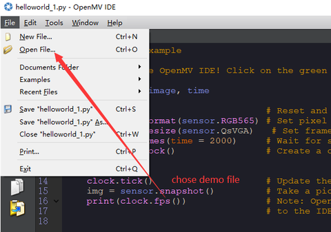 Click File -> Open File... to select the .py file and open it.