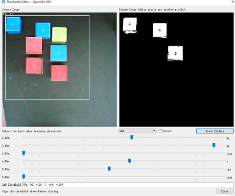 Adjusting the values according to your environment until you can see the shape of the Objects in the Binary Image area. Copy the LAB Threshold value to replace the corresponding color value.